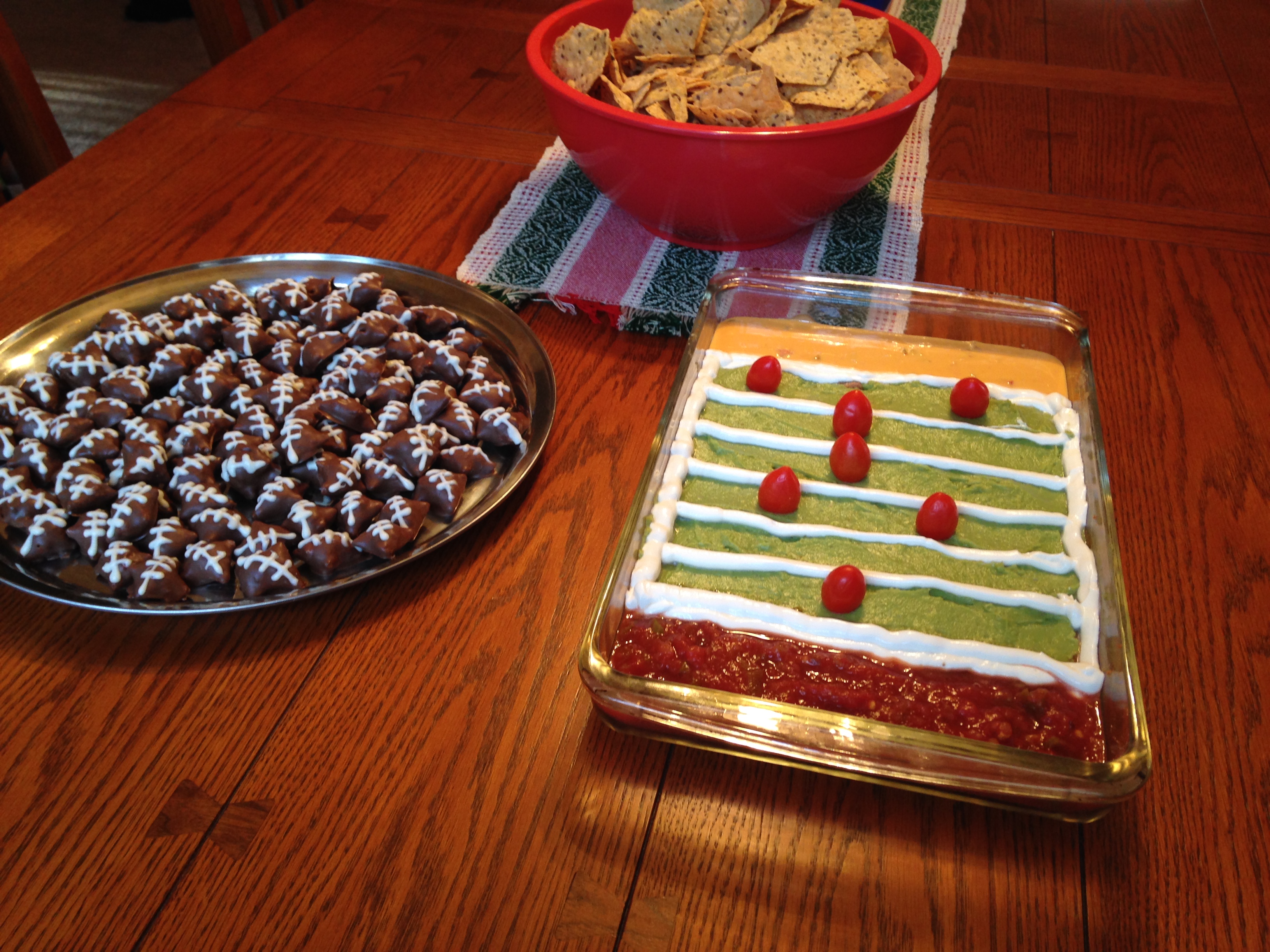 Sunday – lots of afternoon Superbowl snacking at my parents house – how cute are the little footballs (chocolate covered peanut butter filled pretzels) and the layered dip football field my mom made?!  She’s so creative.