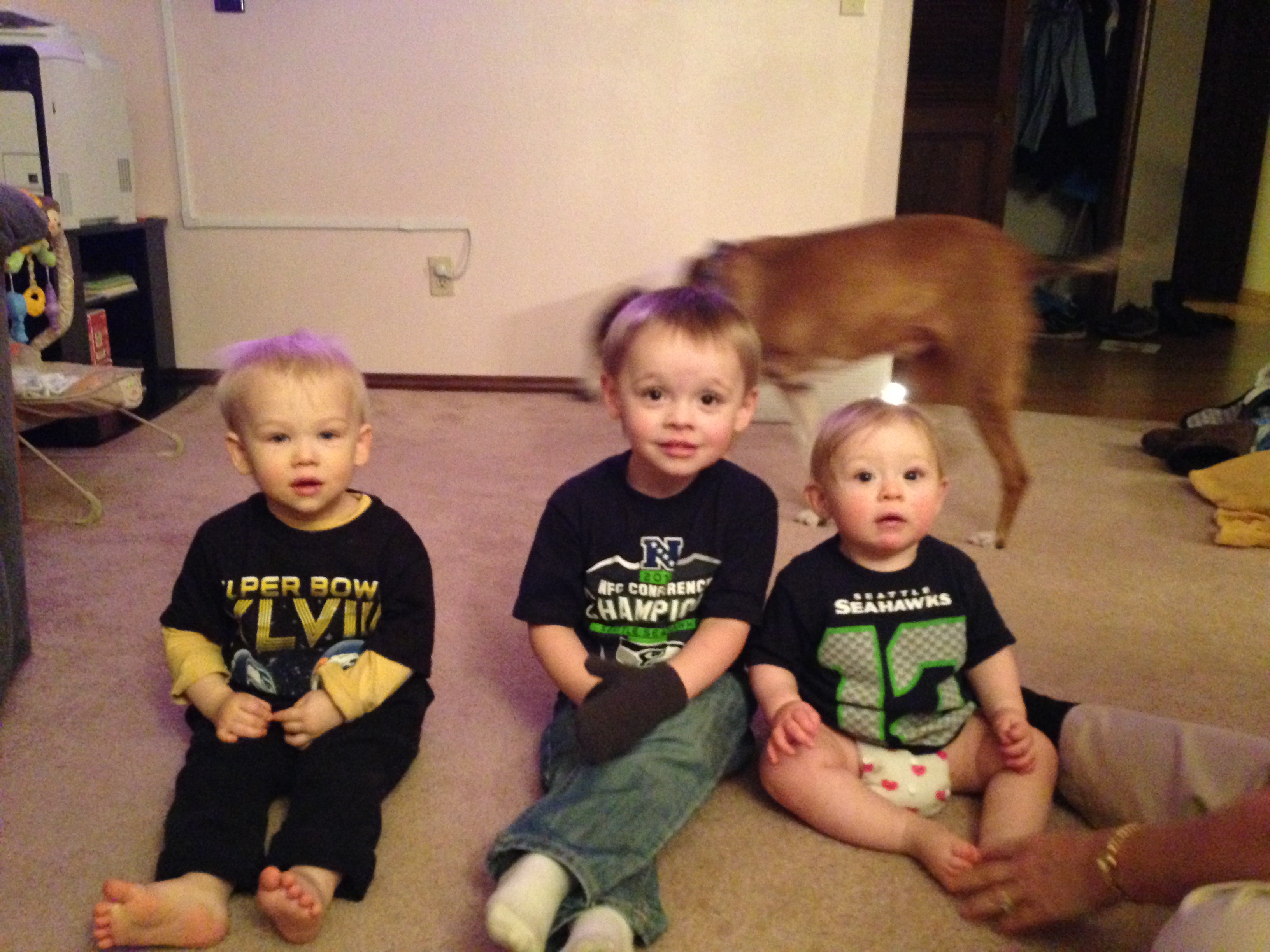 Sunday we watched the superbowl with my family.  Three little Seahawk fans in their finest.