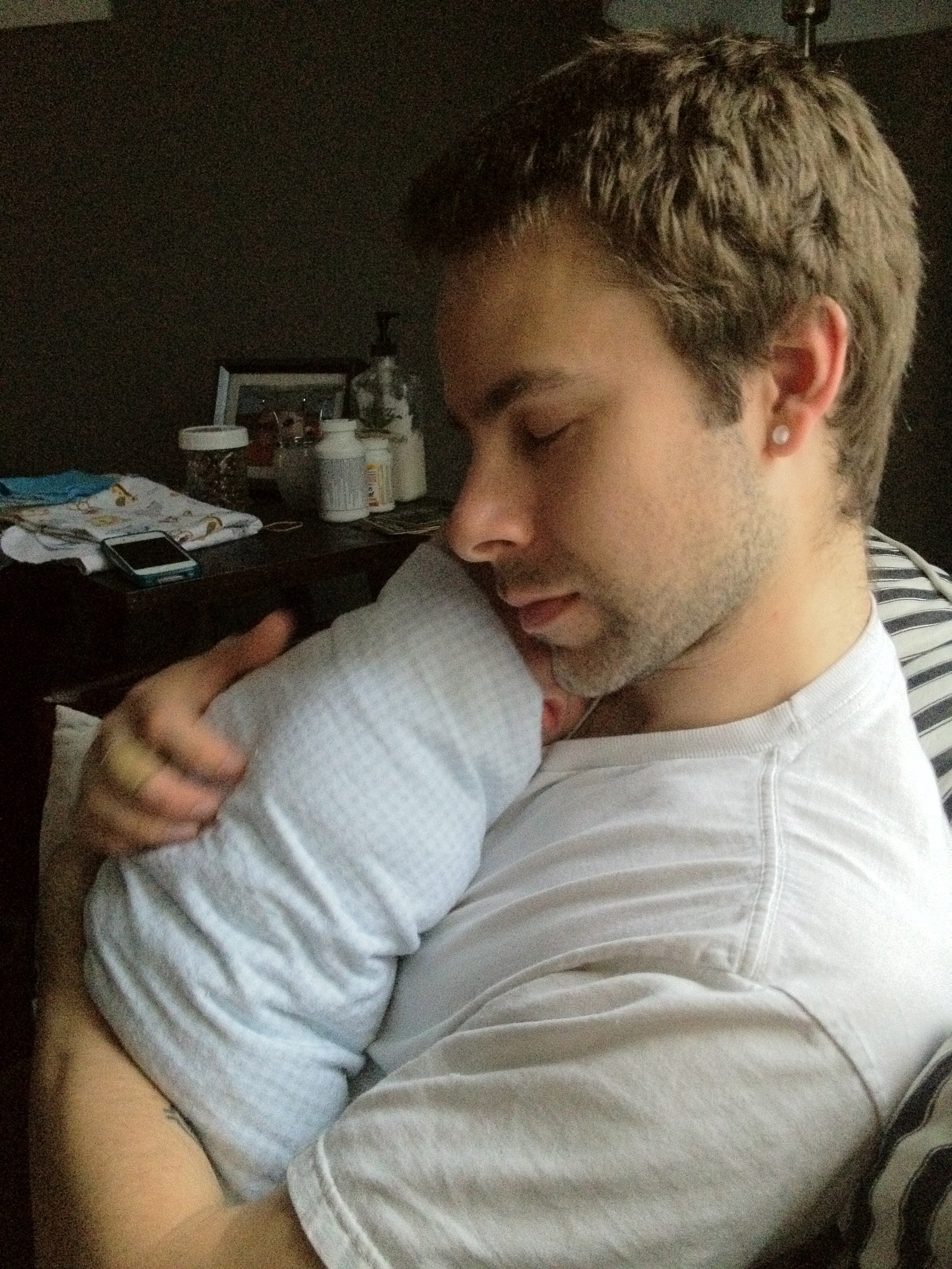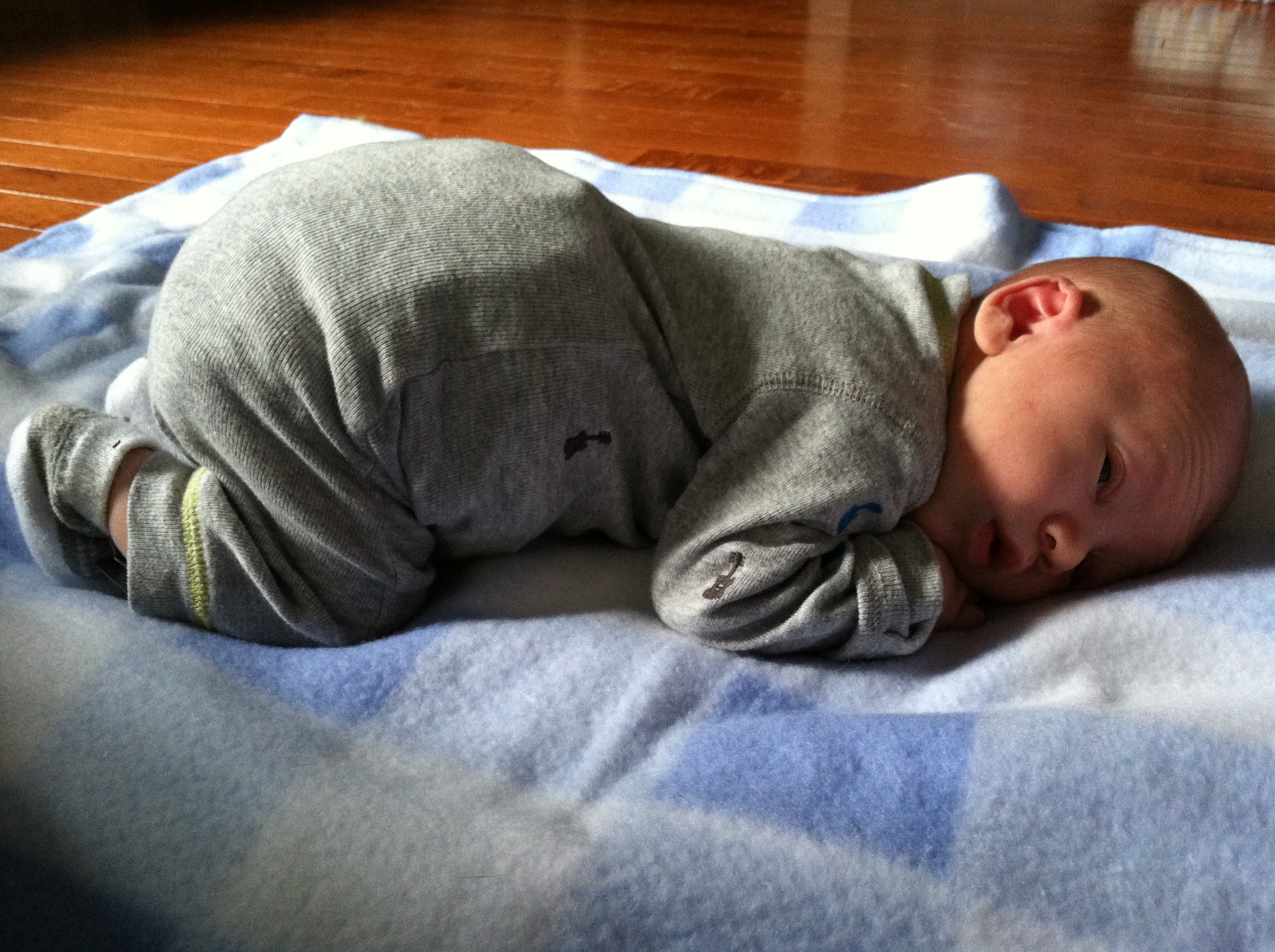 Luckily I’ve figured out how to get him to sleep the majority of the night — on my chest. He boycots sleeping in the pack n play napper set up next to our bed. Occasionally he’ll sleep laying next to me, but only if I put him there after he’s really asleep. Since I figured this out, the past 2 nights I’ve slept from about 9:30pm-6am, waking up about 3 times during the night to feed/change him. I feel sooooo much better now that I’m getting sleep!