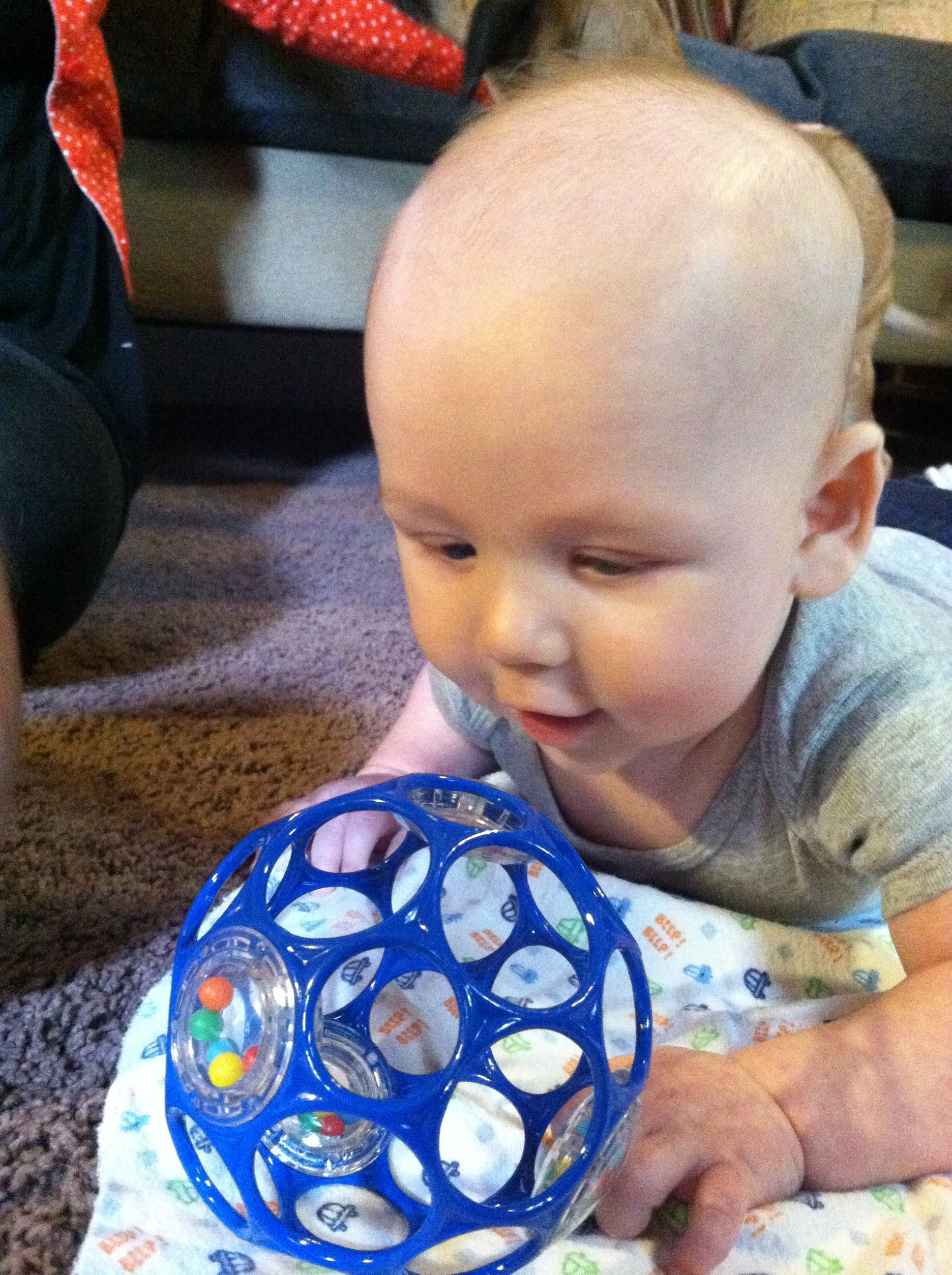 Tummy time is now fun for him, especially when he has someone else’s new toy to look at.