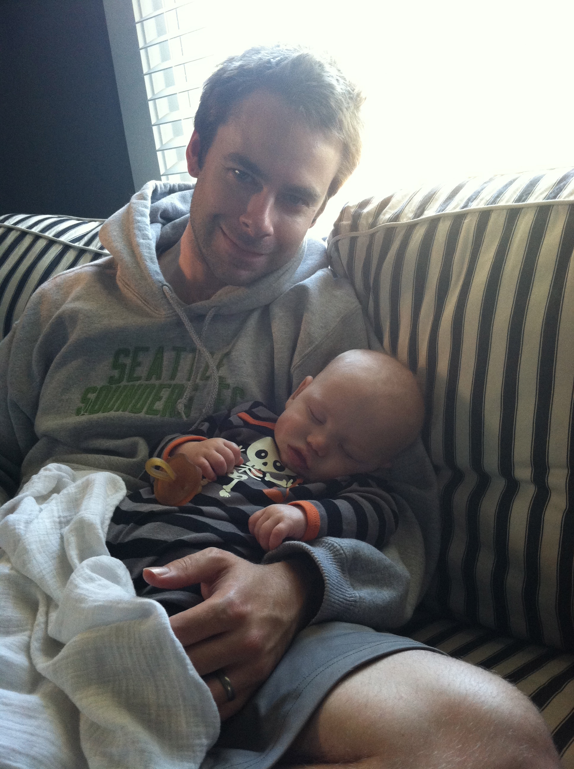 He’s a wonderful napper now too. He’ll just fall asleep in your arms when he gets tired. Or if he’s not wanting to sleep like that, he gets a little fussy, his eyes get red and he starts tugging on his ears. All we do then is swaddle him up, give him the paci and he’s out! We still swaddle him for most naps, but no longer for nighttime sleep.