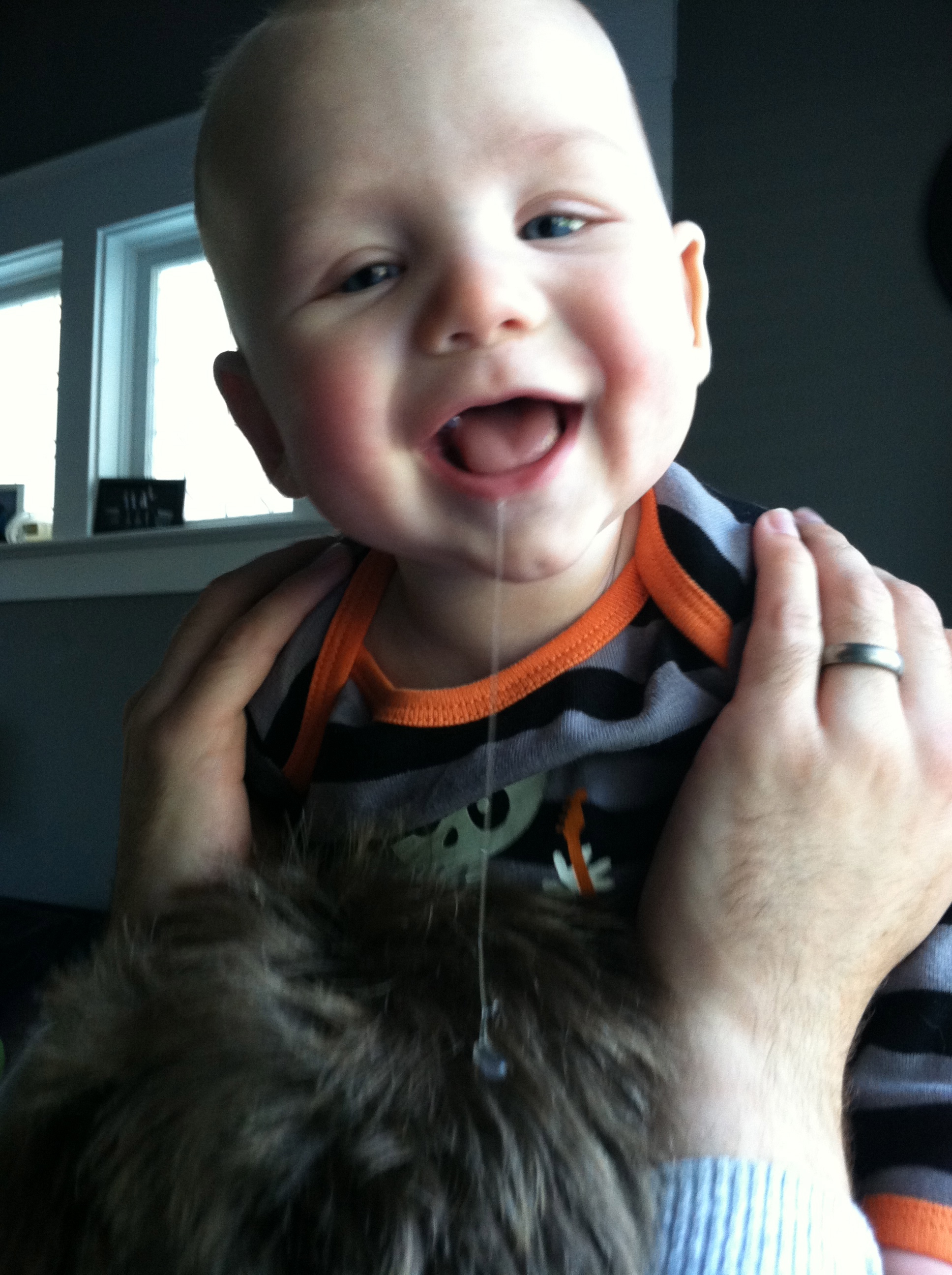 Just last night he was bouncing around on Jacob’s shoulders, and I caught the most awesome thing…. drool!