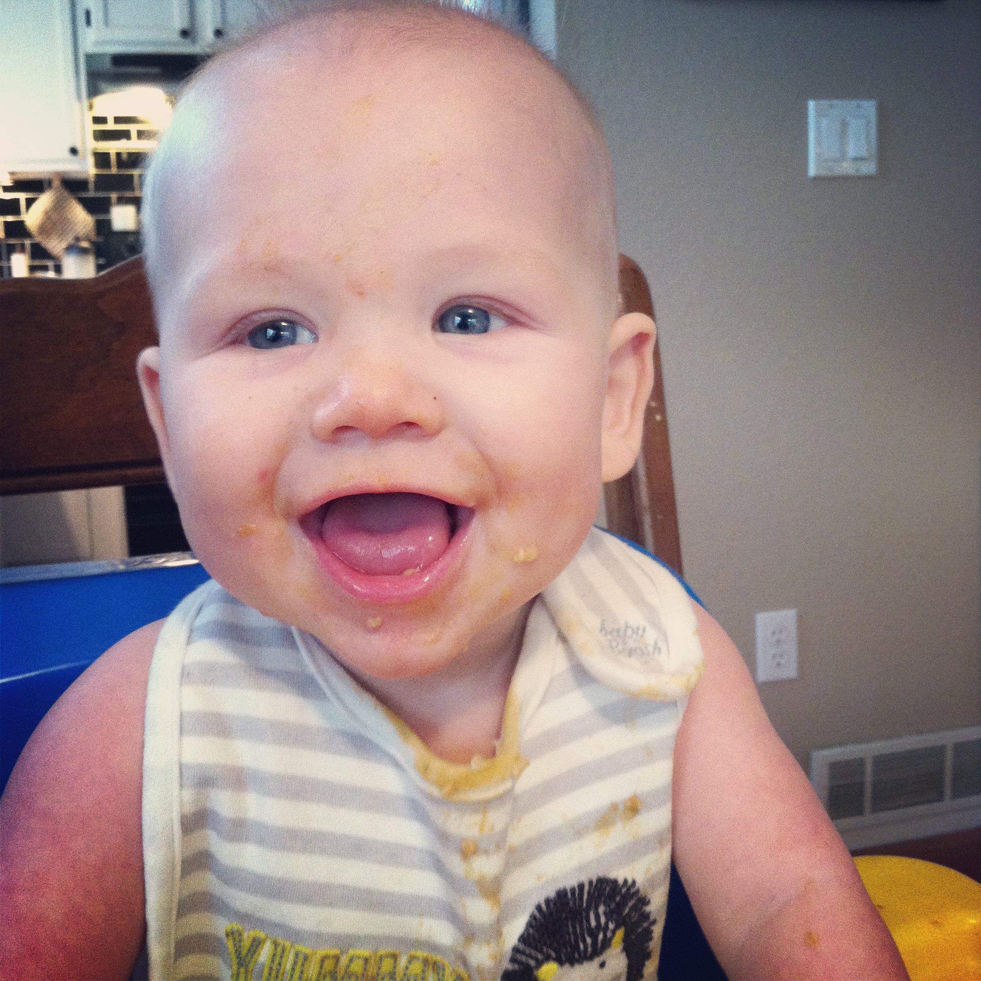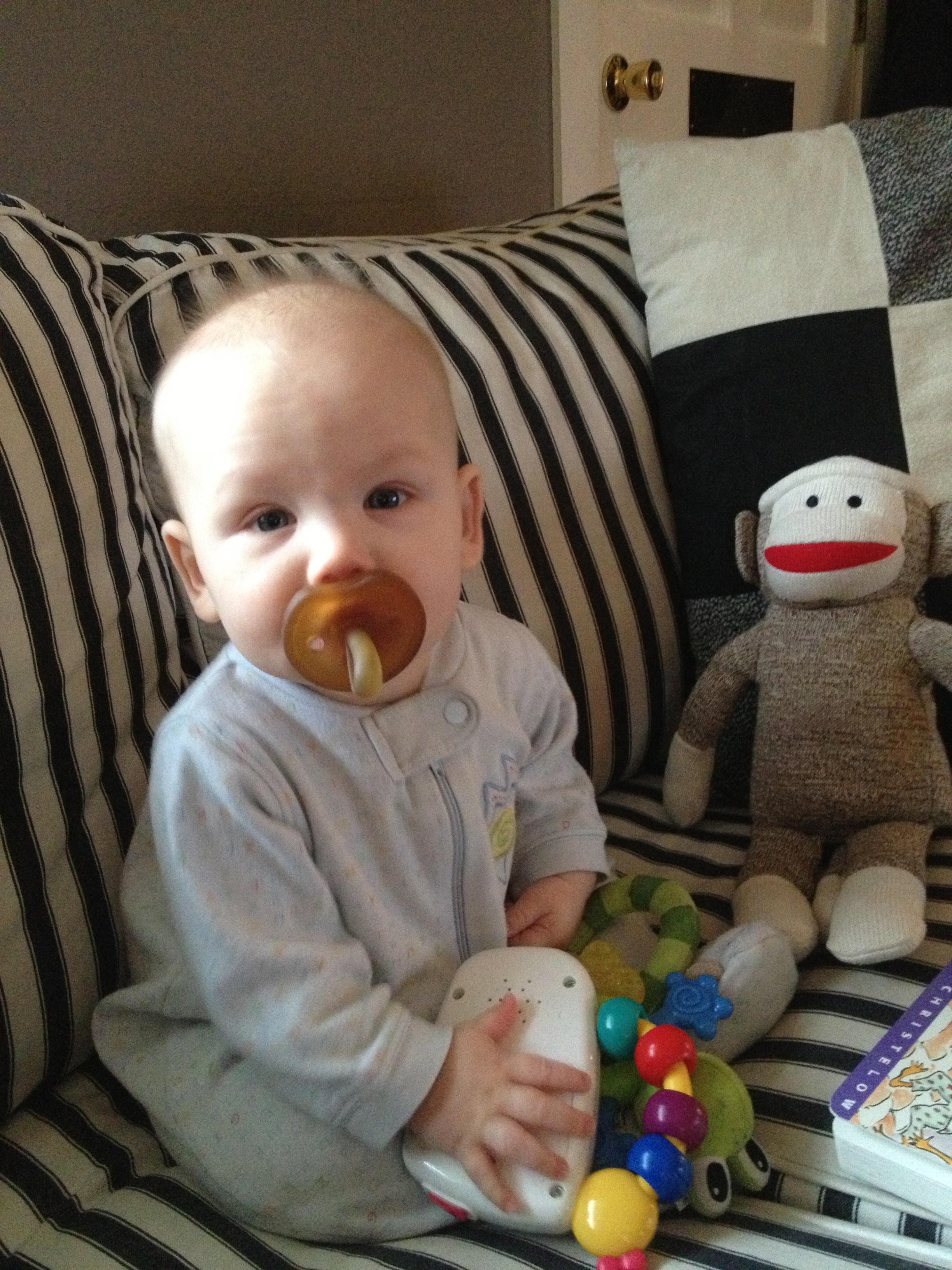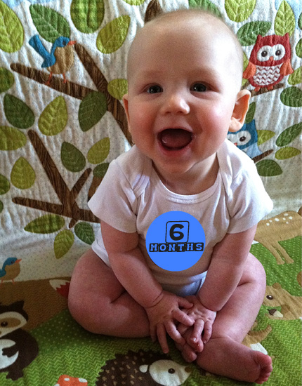 For the most part he’s still sleeping pretty well. He typically sleeps about 9 hours a night. We still have random wake ups, like last night, but it could be because of all the new foods we’ve been introducing, or maybe he’s teething too. He’s been gnawing like crazy and a bit more drooly.