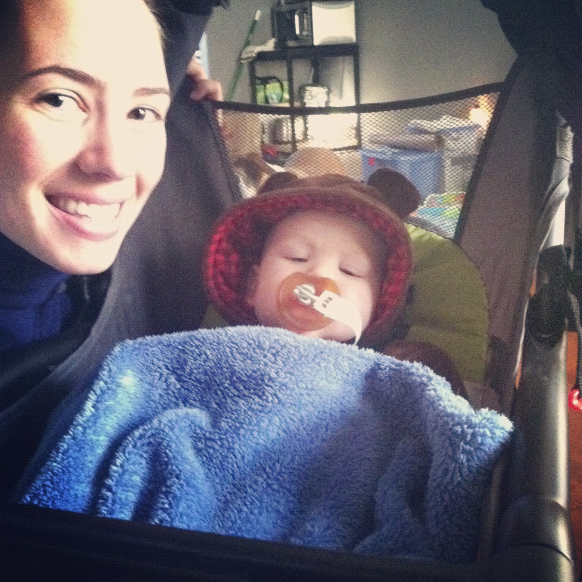 We nixed the infant car seat for the stroller runs. He chills out like a big boy now.