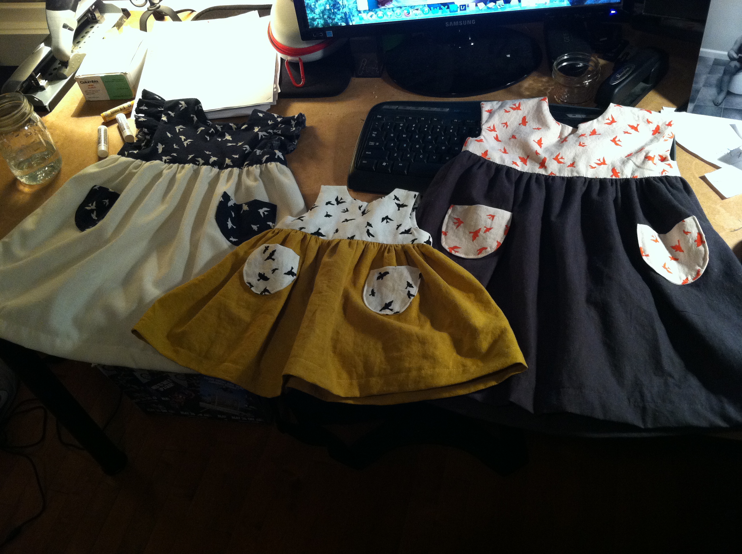 For my nieces I sewed up a couple geranium dresses in the 18-24 month size. I love how they all coordinate (middle one is for our little girl) but don’t match. I want them all for me!