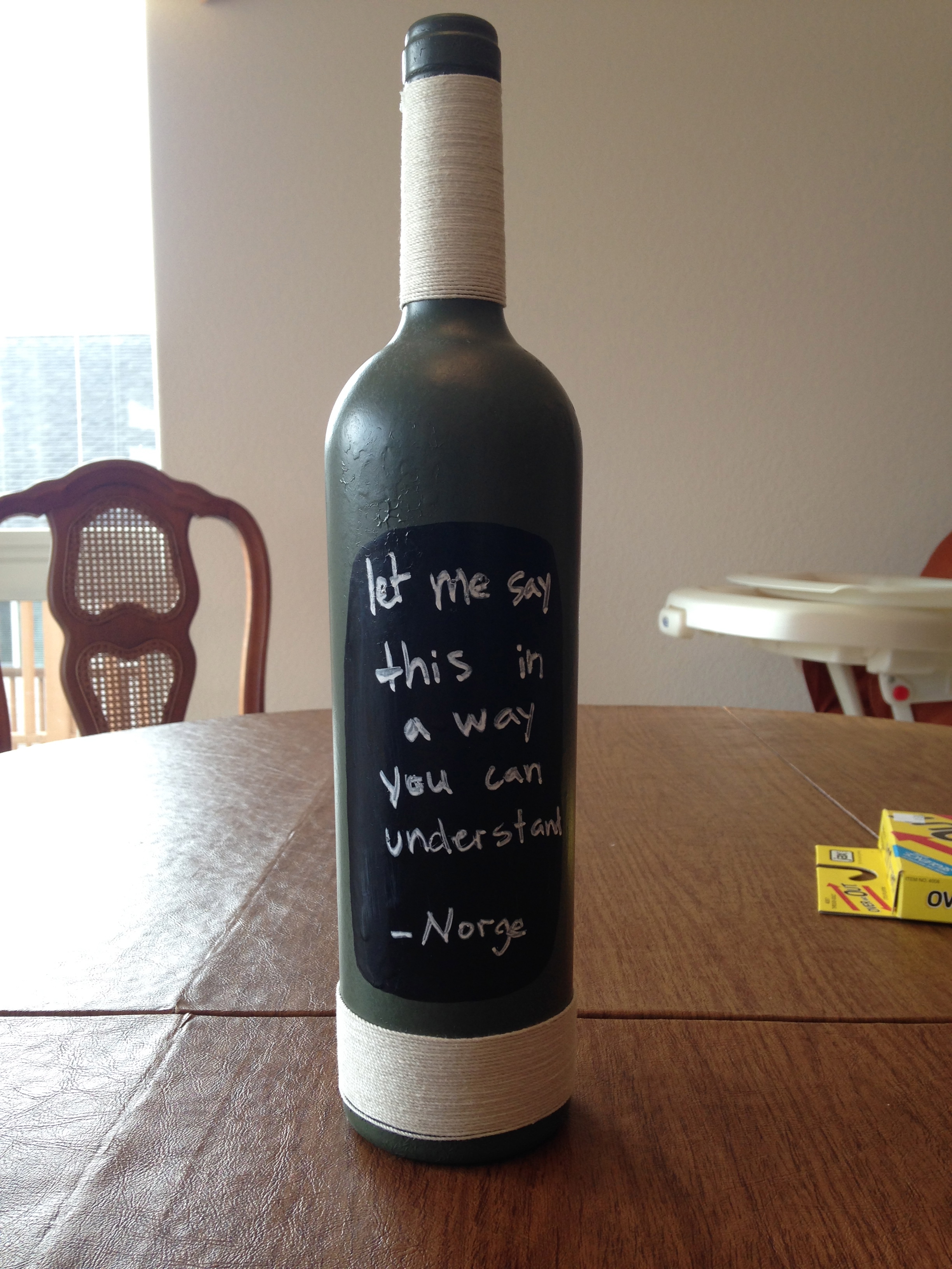 I spray painted a wine bottle and added chalkboard paint for a chalkboard wine bottle. I had actually planned to make 3 different colors, but the other two looked really bad (running paint) so I gave up and focused on this one. Gifted to my uncle Norge, with a Norge quote already on it.