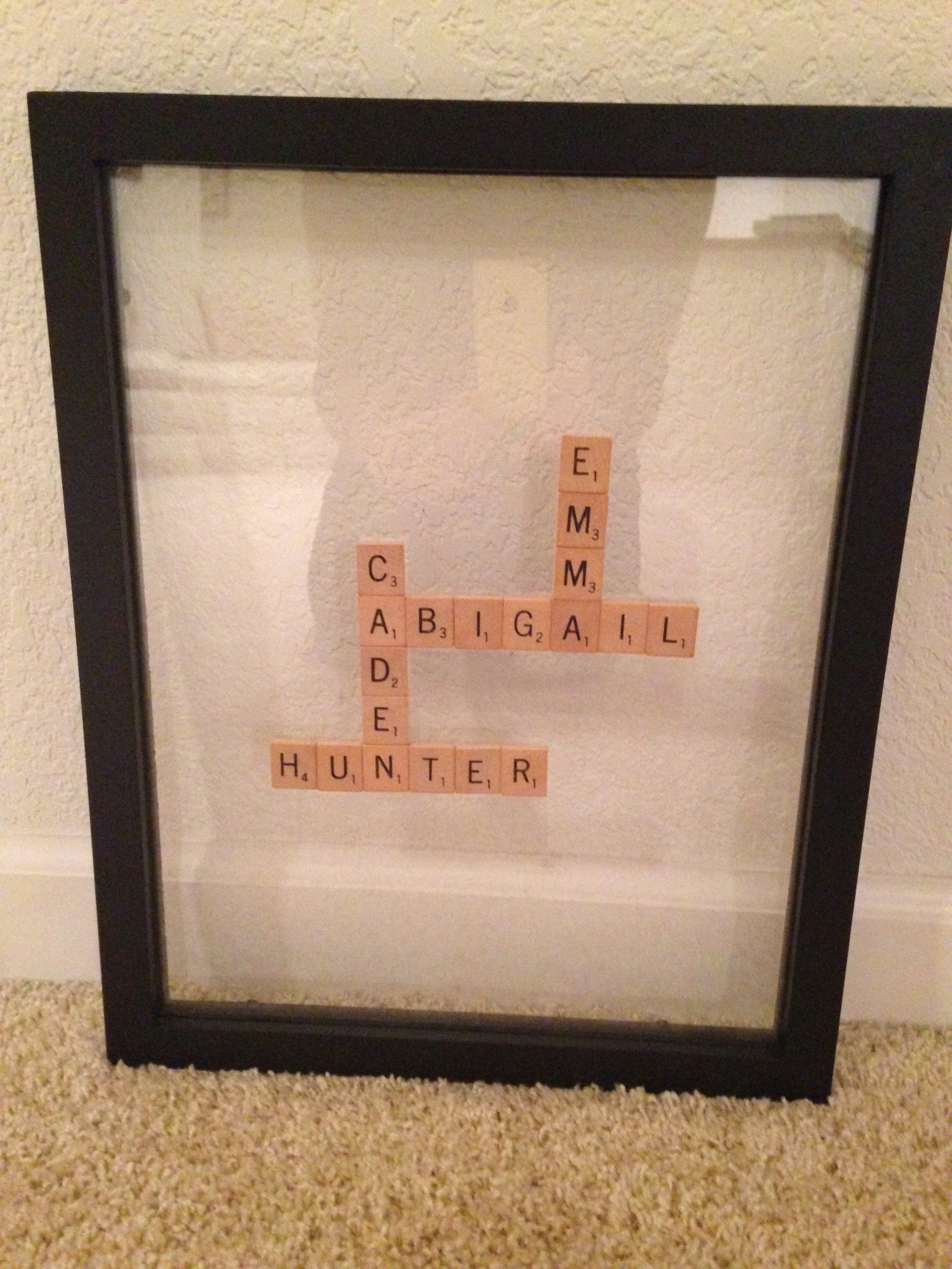 For my mom, who loves scrabble, I made a grand kid scrabble tile picture frame. So far she has 4 grand kids, but #5 will arrive soon! I made sure her secret name will work into it as well.