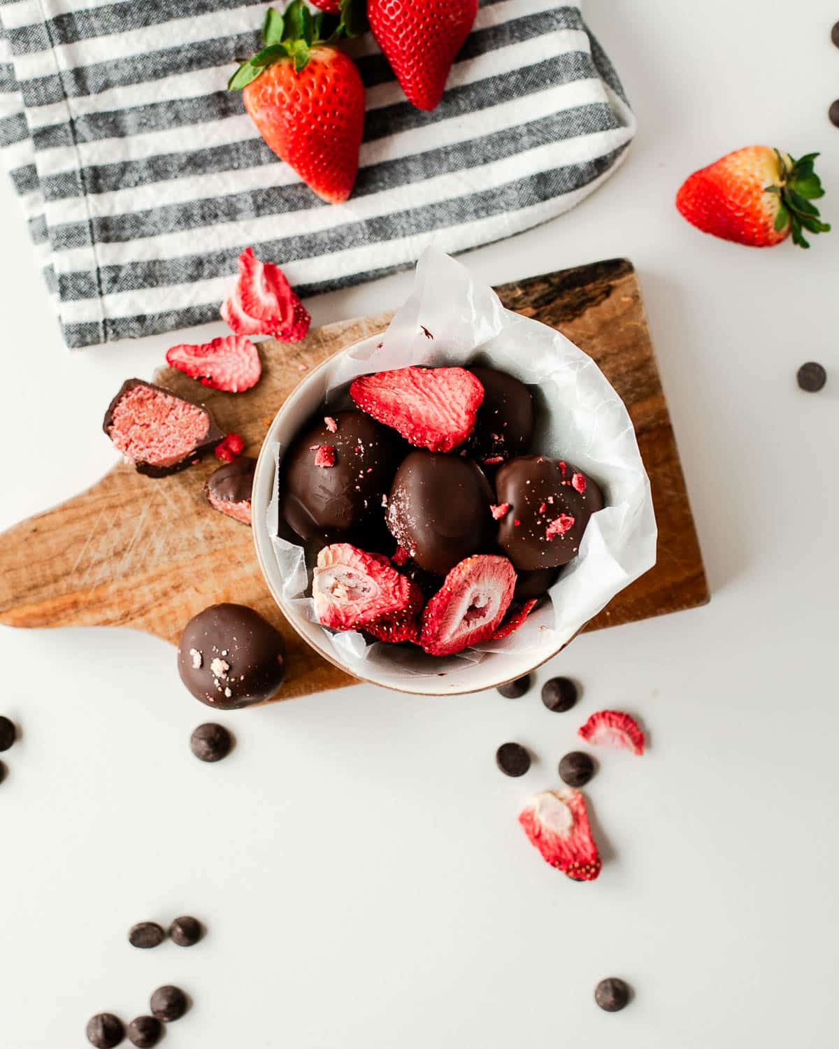Roll the strawberry bliss balls into chocolate and chill in the fridge or freezer until set.